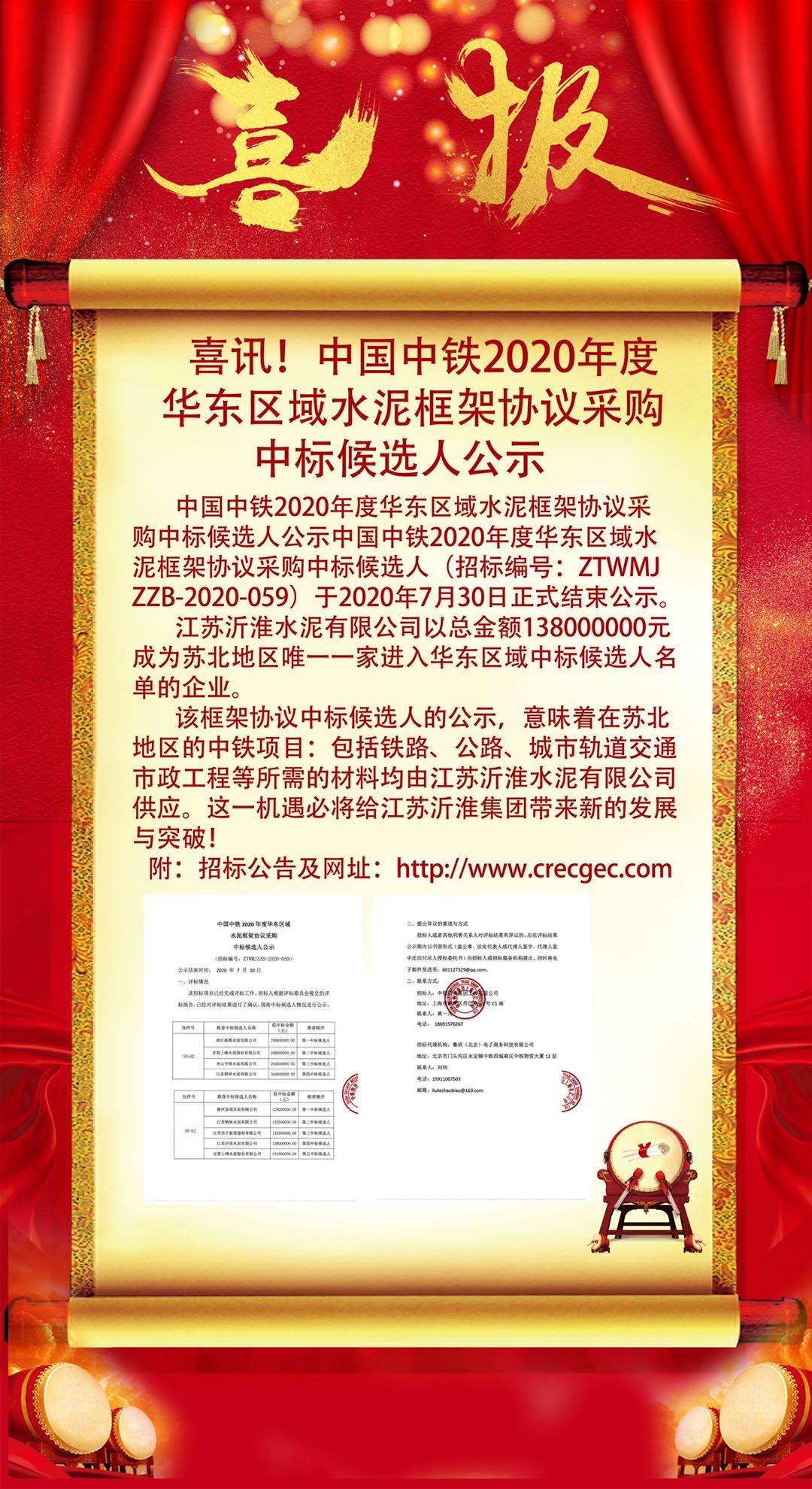 中国中铁2020年度华东区域水泥框架协议采购中标候选人(招标编号:ZTWMJZZB-2020-059)于2020年7月30日正式结束公示,江苏沂淮水泥有限公司以总金额1380000000元成为苏北地区唯一一家进入华东区域中标候选人名单的企业。…… 【阅读全文】