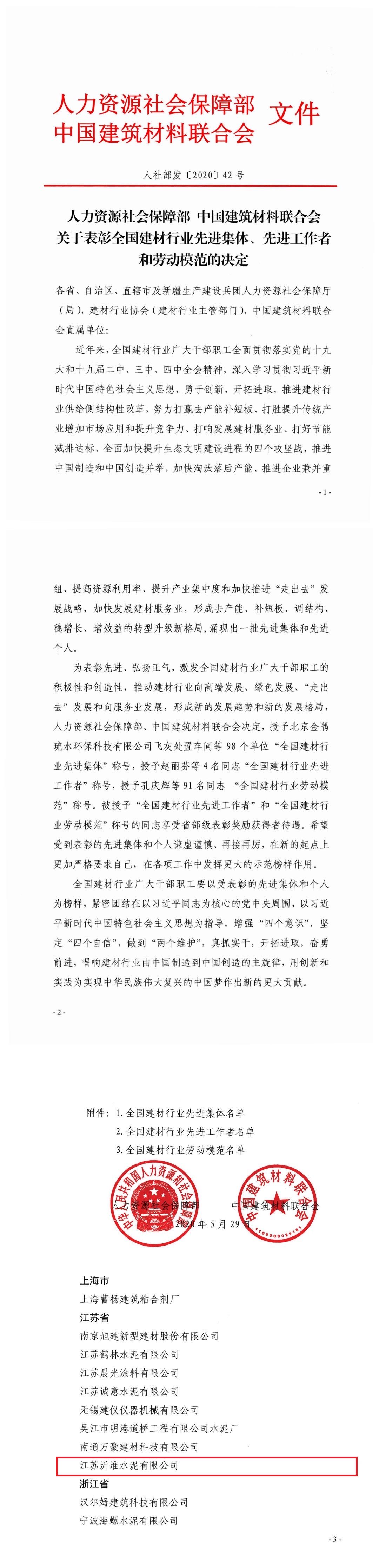 2020年6月,江苏沂淮集团被国家人力资源社会保障部授予全国建材行业先进集体,是苏北唯一一家获此殊荣企业。 |